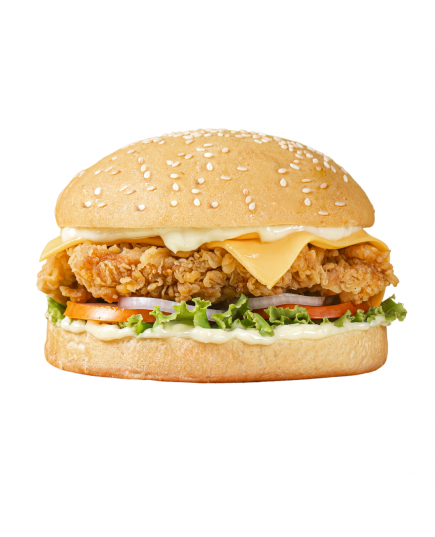 | Savory garlic sauce coats a crispy chicken fillet, enhanced by fresh shredded lettuce, ripe tomatoes, and sliced onions, all nestled under sliced cheese on a sesame bun. |